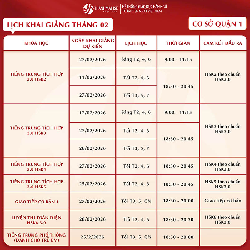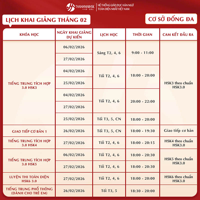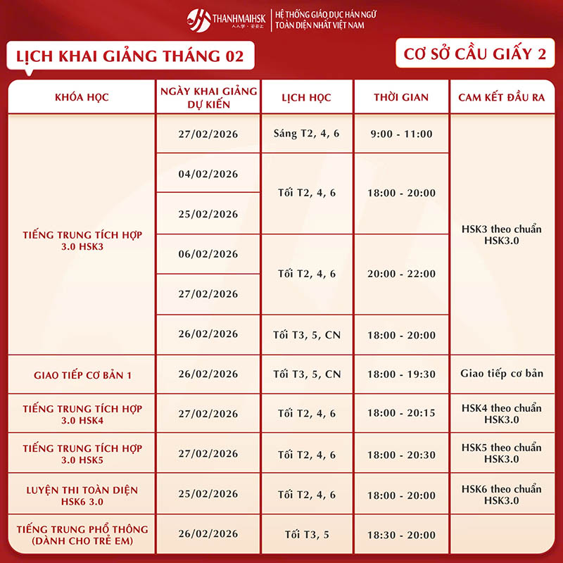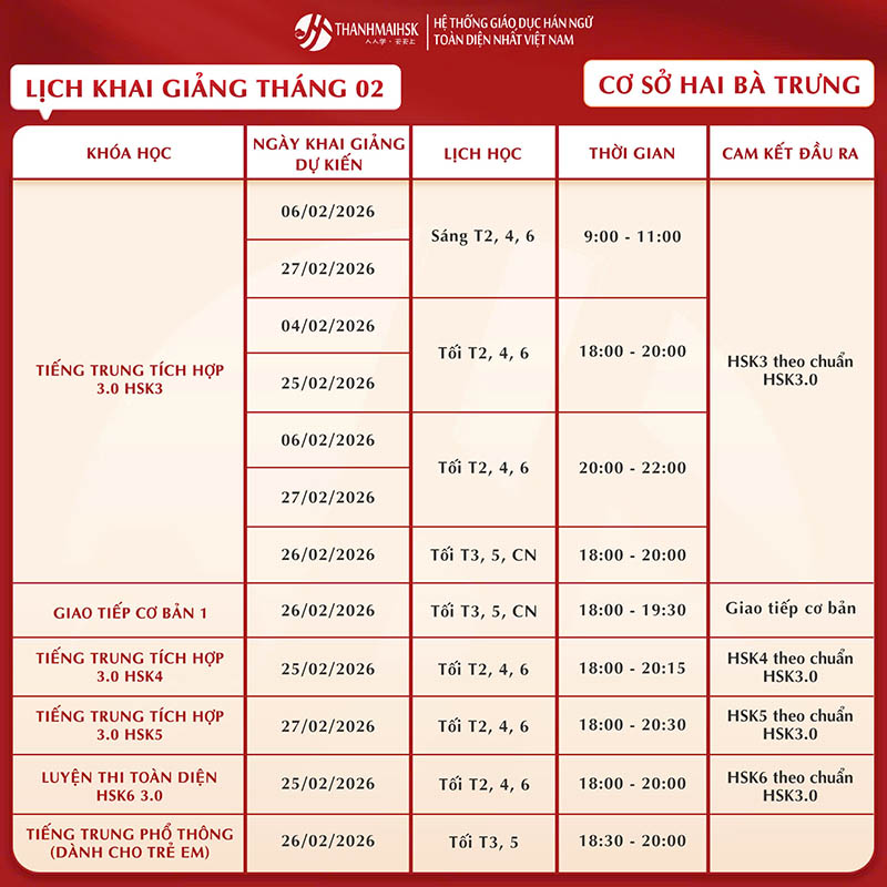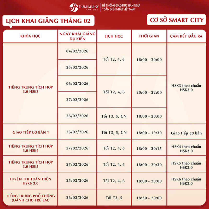 Lịch khai giảng khóa học tháng 2/2026 tại THANHMAIHSK