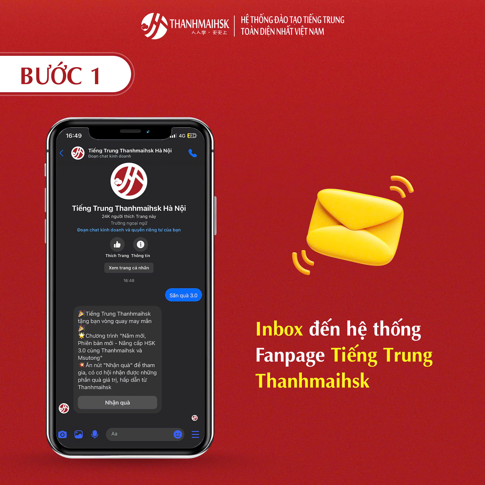 - Bước 1: Inbox đến hệ thống fanpage Tiếng Trung Thanhmaihsk