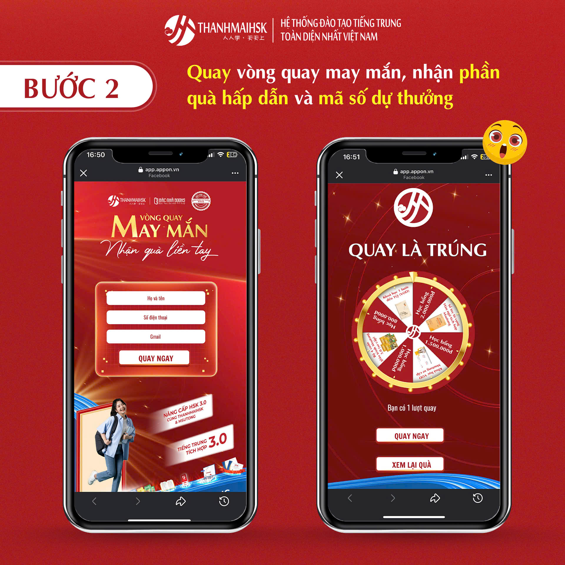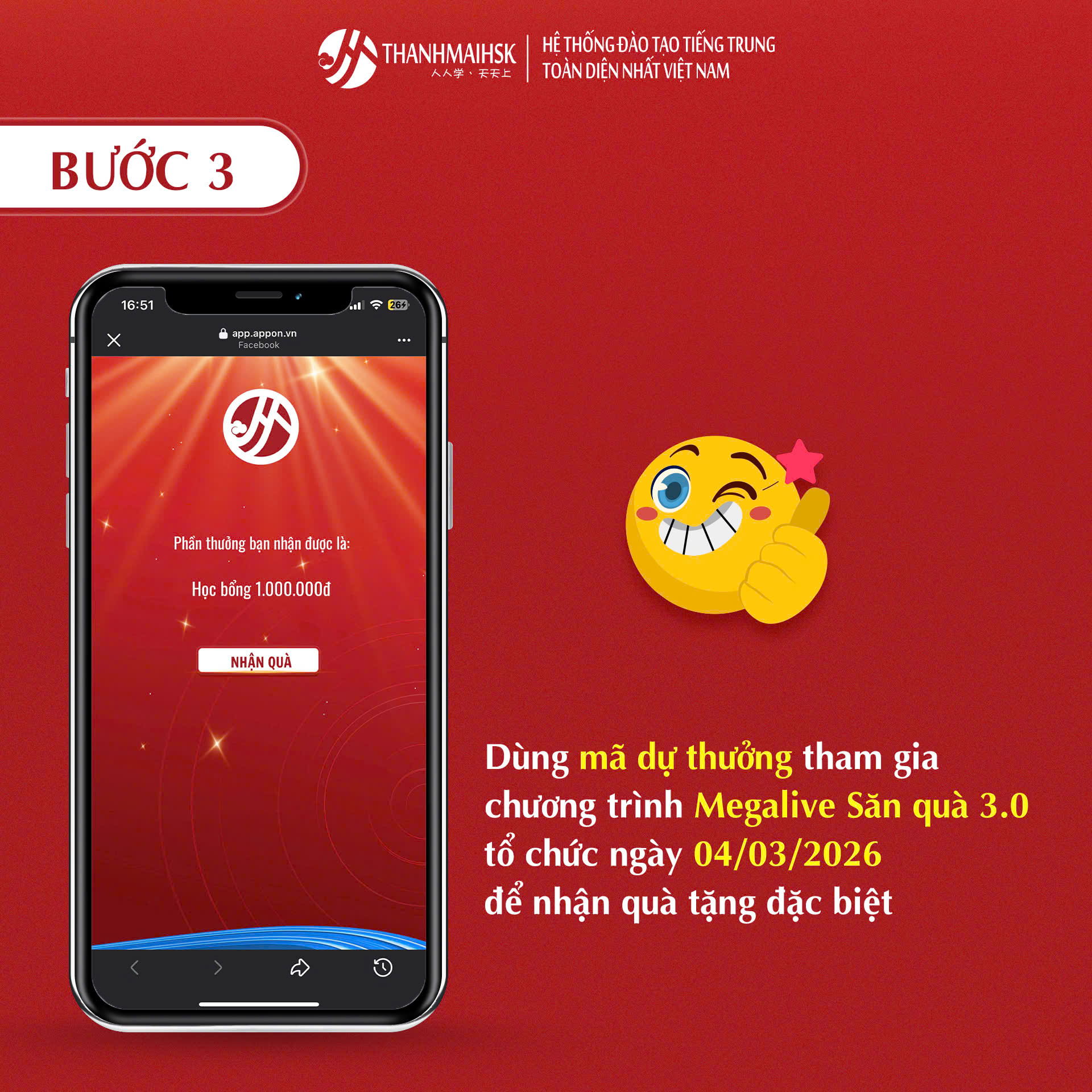 Nhân dịp ra mắt khóa học mới Tiếng Trung tích hợp 3.0, Thanhmaihsk chính thức triển khai chương trình ưu đãi đặc biệt mang tên Săn Quà 3.0 Thanhmaihsk – Quay là trúng, dành riêng cho học viên đăng ký khóa học trong thời gian diễn ra chương trình.